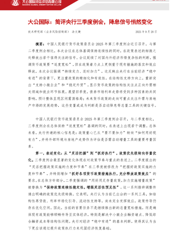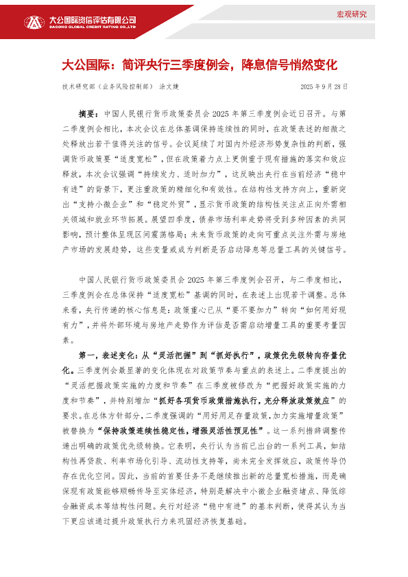 【大公国际资信评估】【202509】简评央行三季度例会,降息信号悄然变化-4页