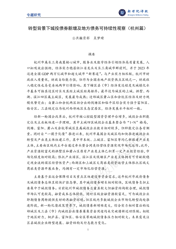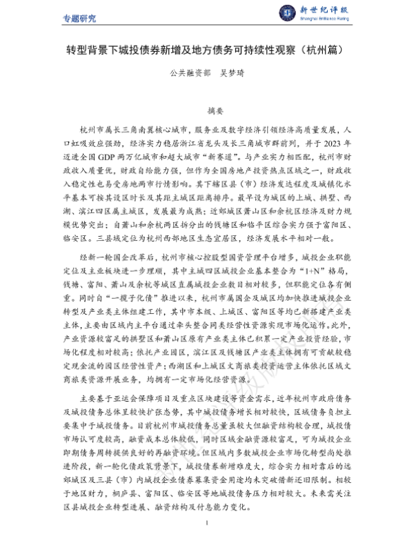 【新世纪评级】【2024】转型背景下城投债券新增及地方债务可持续性观察(杭州篇)-21页