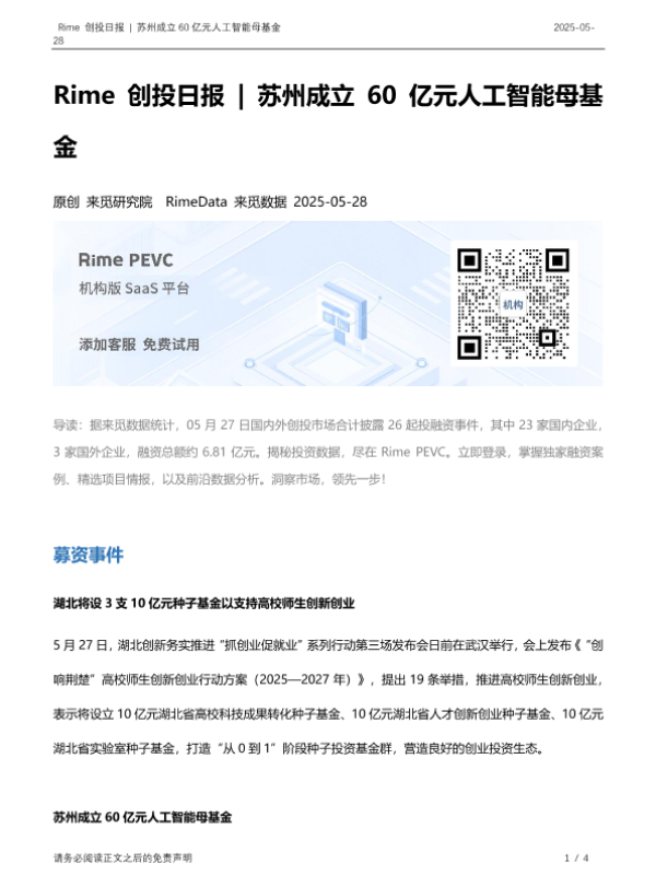 【来觅研究院&RimeData来觅数据】【202505】Rime创投日报 | 苏州成立 60亿元人工智能母基金-4页