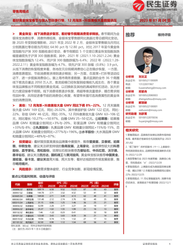 【民生证券】【20230108】零售周观点:看好黄金珠宝春节与情人节旺季行情,12月淘系+抖音美妆大盘数据承压-21页