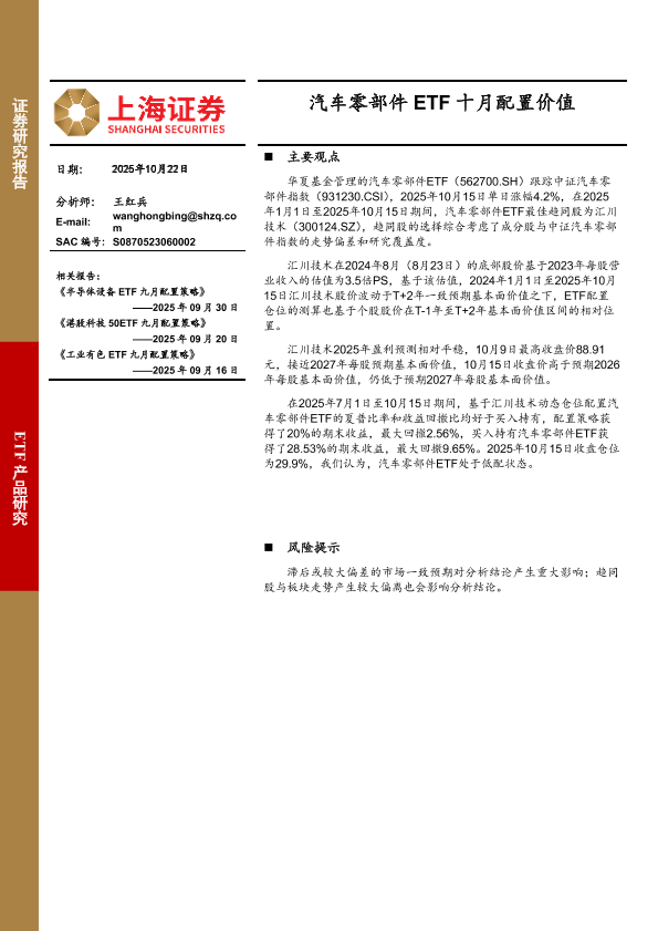 【上海证券】【202510】汽车零部件 ETF十月配置价值-6页