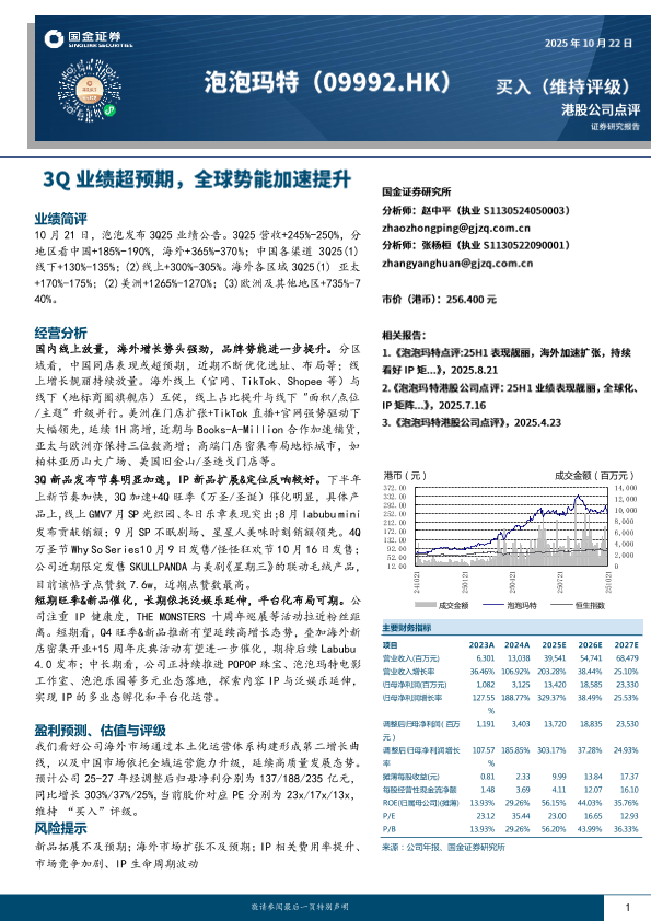 投资评级 IP经济 业绩公告 海外市场 泡泡玛特