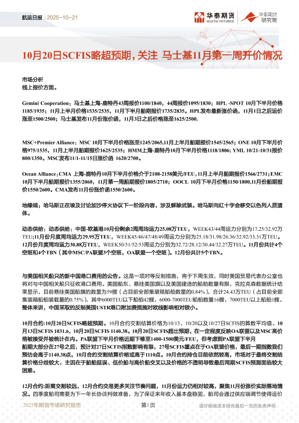 【华泰期货】【202510】航运日报_10月20日SCFIS略超预期_关注马士基11月第一周开价情况-14页