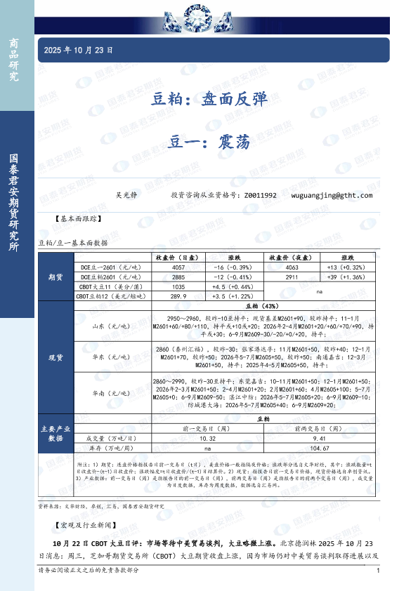 【国泰君安期货】【202510】豆三粕:盘面反弹, 国泰君豆一:震荡-3页