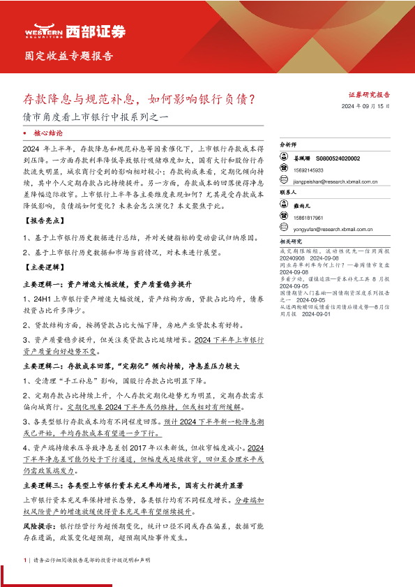 【西部证券】【202409】债市角度看上市银行中报系列之一_存款降息与规范补息,如何影响银行负债?-17页