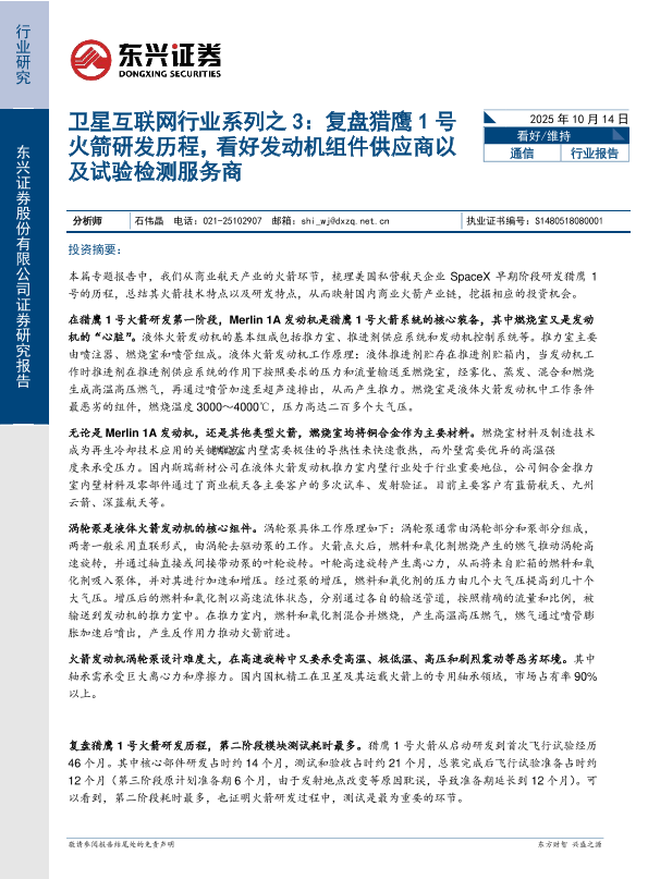 【东兴证券】【202510】卫星互联网行业系列之3:复盘猎鹰1号火箭研发历程,看好发动机组件供应商以及试验检测服务商-17页