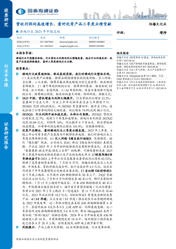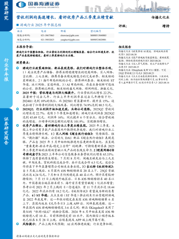 利润增长 中报总结 营收增长 产品表现 游戏行业