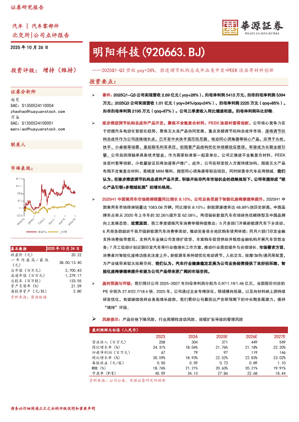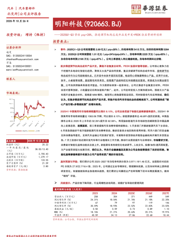 【华源证券】【202510】明阳科技(920663.BJ)——2025Q1-Q3营收 yoy+28%,推进调节机构总成件品类开发+PEEK涂层等材料创新-3页