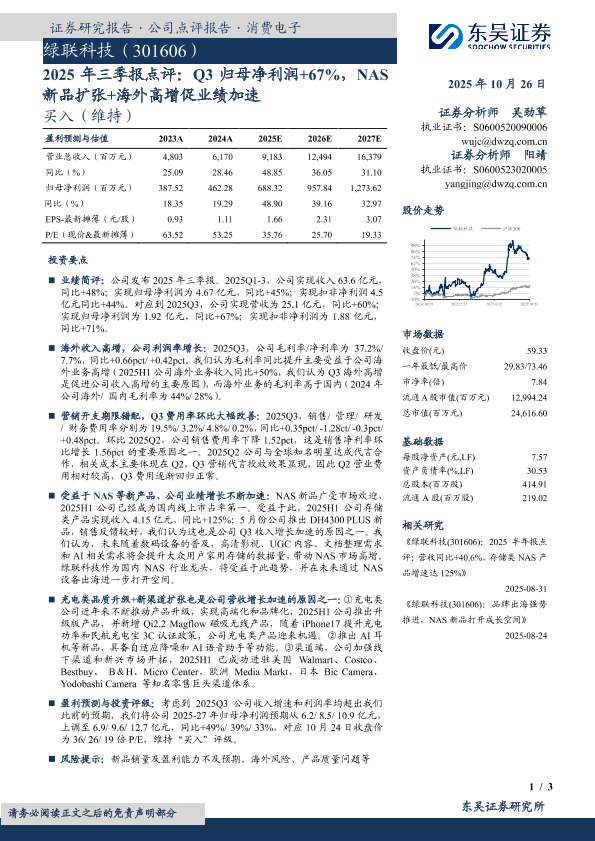 【东吴证券】【202510】2025年三季报点评:Q3归母净利润+67%,NAS新品扩张+海外高增促业绩加速-3页