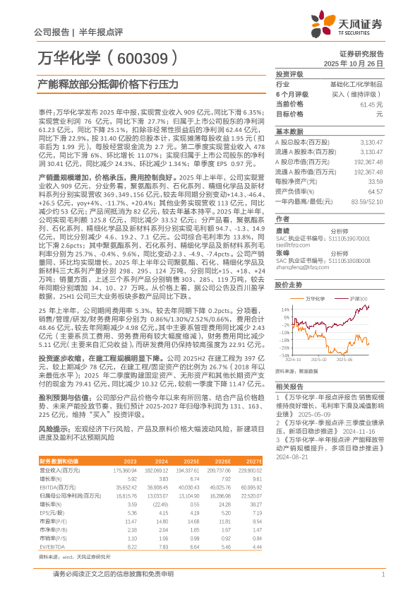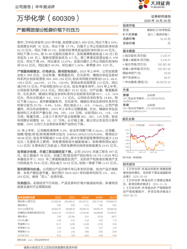 【天风证券】【202510】万华化学-半年报点评 产能释放带动产销规模提升,多项目稳步推进-8页