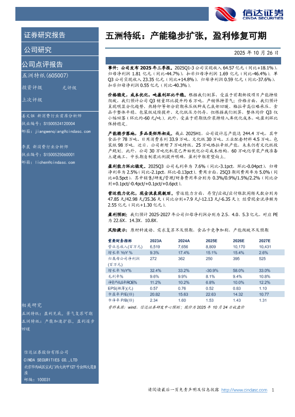 【信达证券】【202510】五洲特纸:产能稳步扩张,盈利修复可期-4页