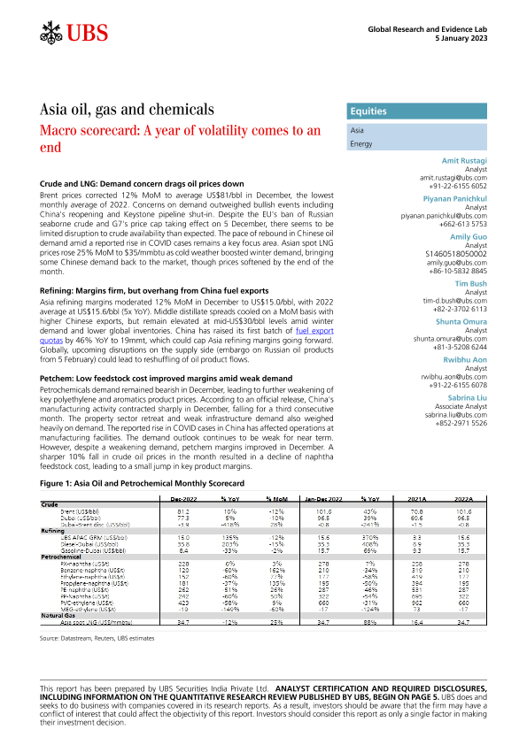【UBS Securities India Private Ltd】【20230105】Asia oil, gas and chemicals Macro scorecard A year of volatility comes to an end-12页