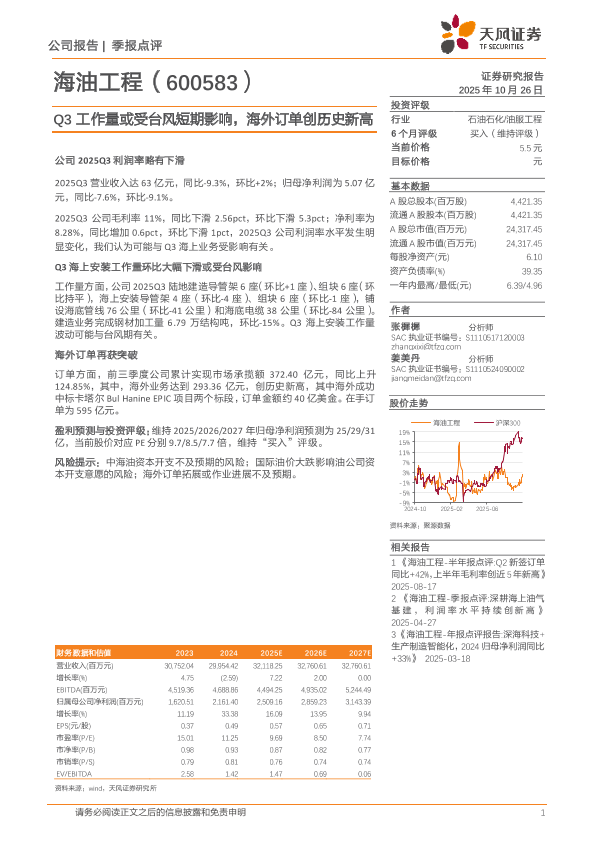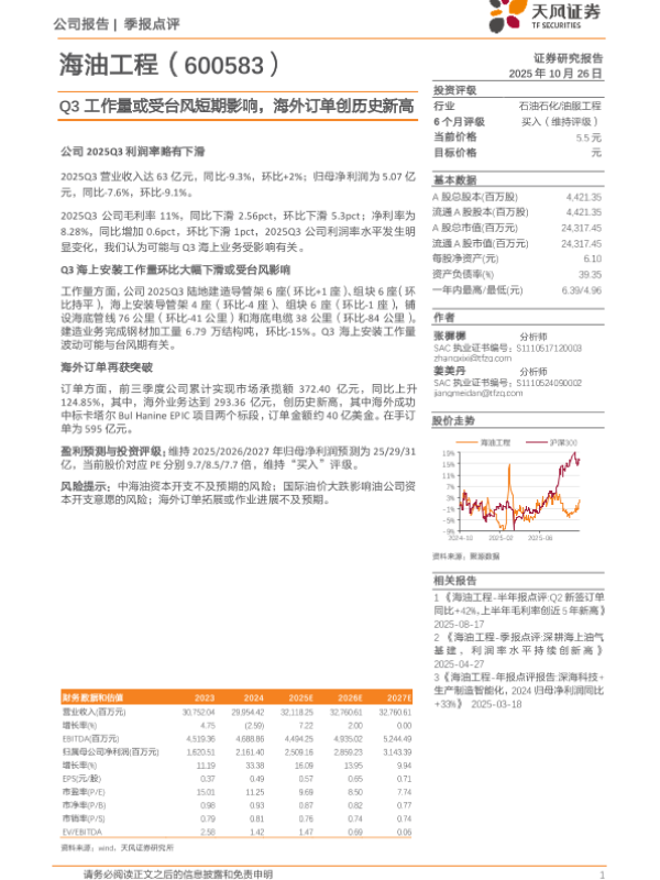 【天风证券】【202510】海油工程-季报点评 Q3工作量或受台风短期影响,海外订单创历史新高-3页