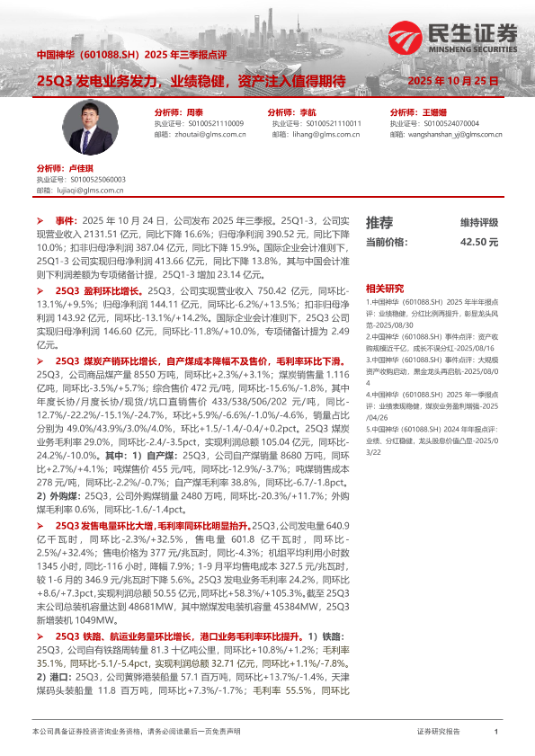 【民生证券】【202510】中国神华(601088.SH)2025年三季报点评:25Q3发电业务发力,业绩稳健,资产注入值得期待-4页