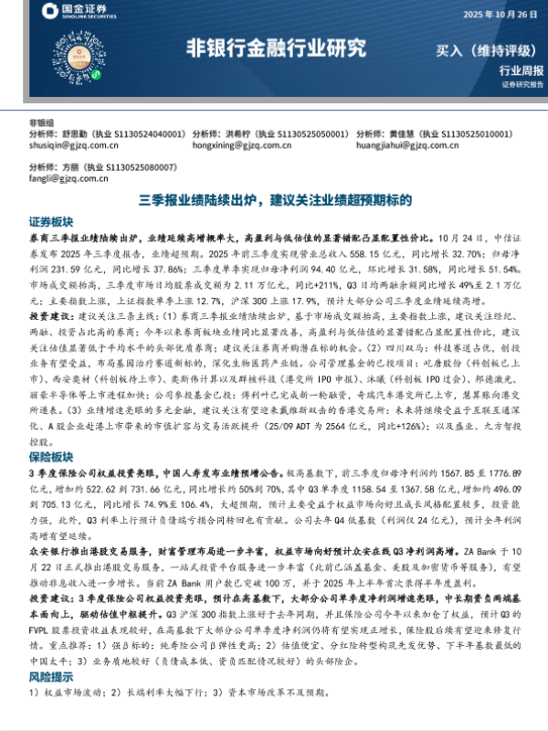【国金证券】【202510】非银行金融行业研究:三季报业绩陆续出炉,建议关注业绩超预期标的-10页