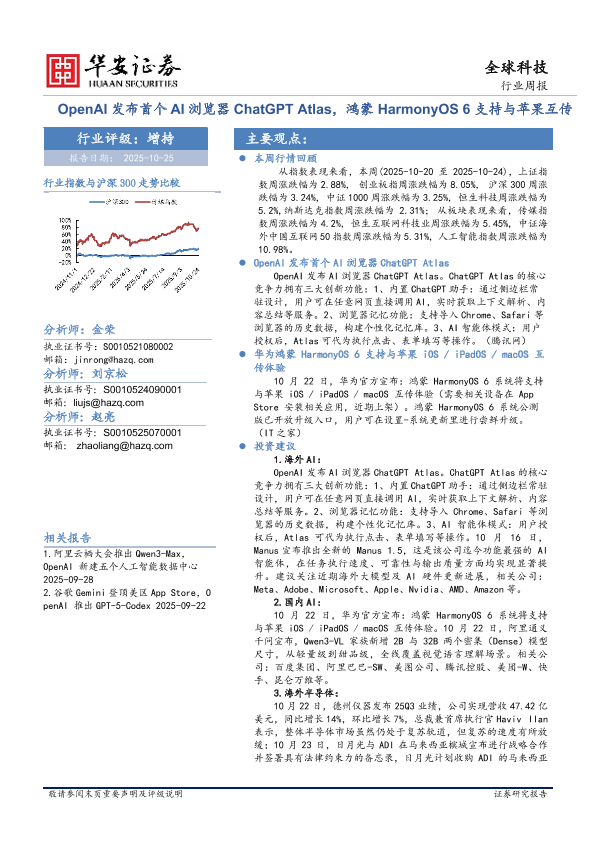 【华安证券】【202510】全球科技行业周报:OpenAI发布首个AI浏览器ChatGPT Atlas,鸿蒙HarmonyOS 6支持与苹果互传-29页