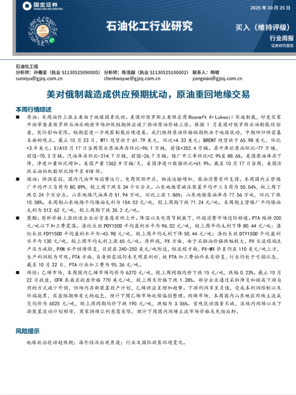 【国金证券】【202510】石油化工行业研究:美对俄制裁造成供应预期扰动,原油重回地缘交易-17页