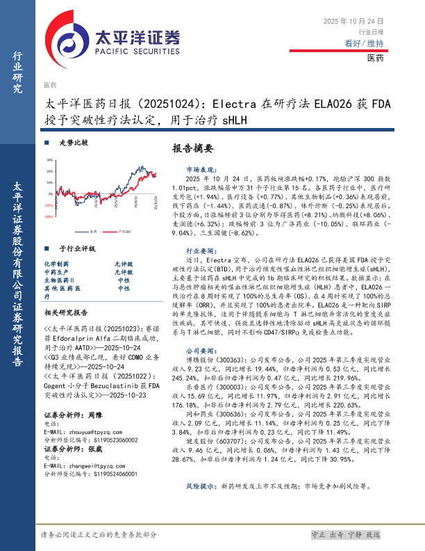 【太平洋证券】【202510】太平洋医药日报(20251024):E lectra在研疗法 ELA026获 FDA 授予突破性疗法认定,用于治疗 sHLH-3页