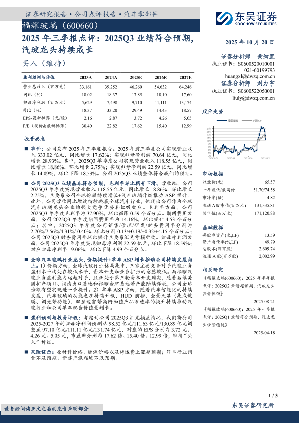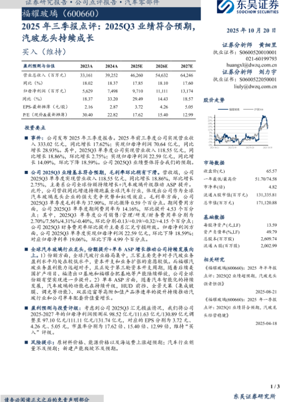 【东吴证券】【202510】2025年三季报点评:2025Q3业绩符合预期,汽玻龙头持续成长-3页