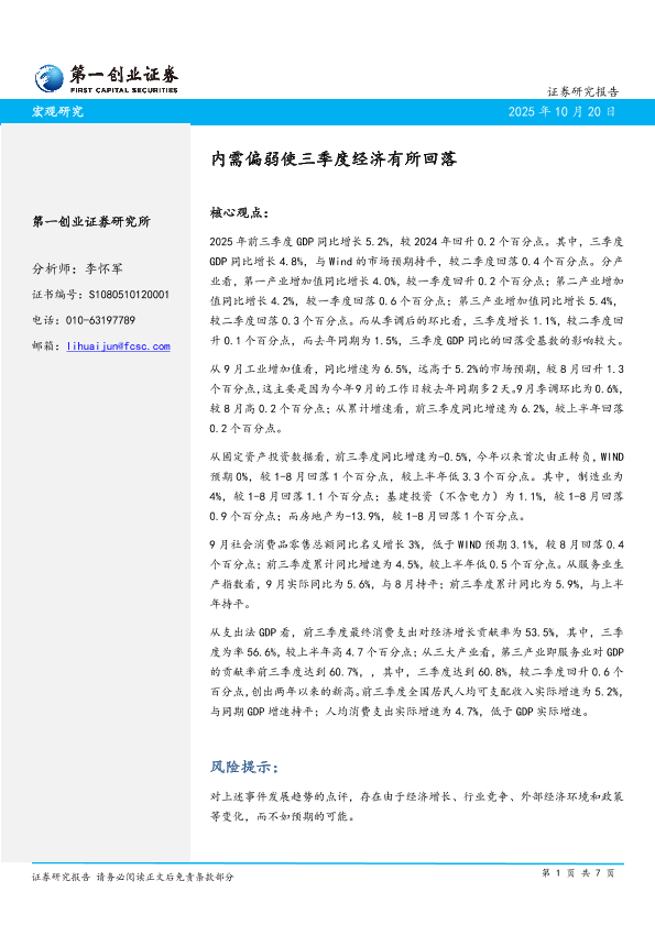 【第一创业证券】【202510】内需偏弱使三季度经济有所回落-7页