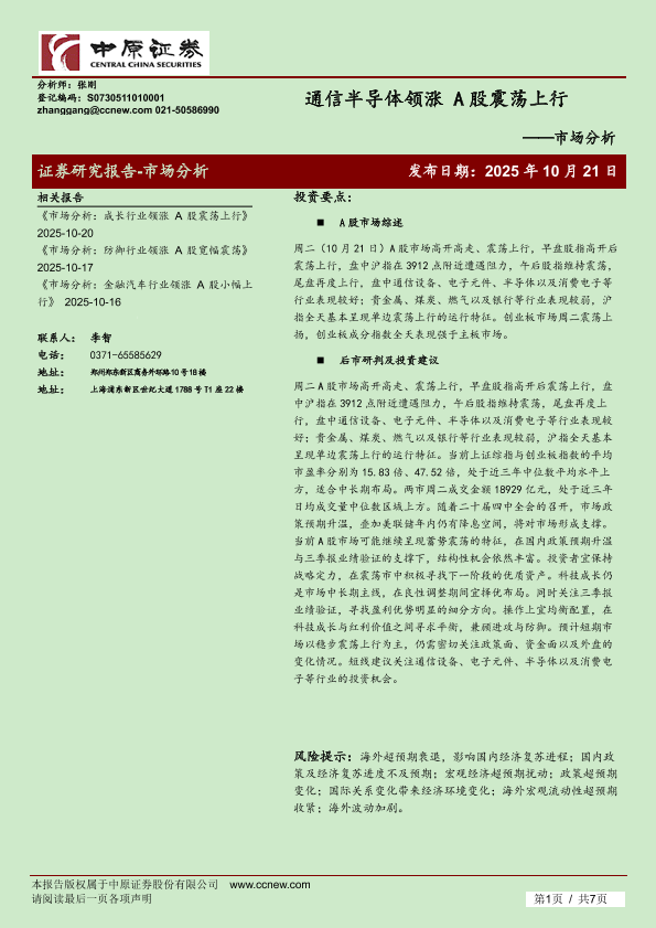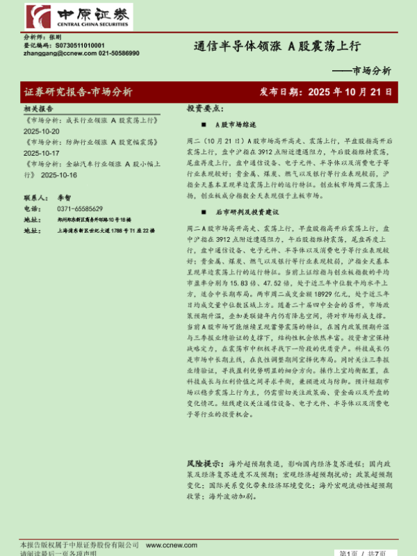 【中原证券】【202510】通信半导体领涨 A股震荡上行-7页