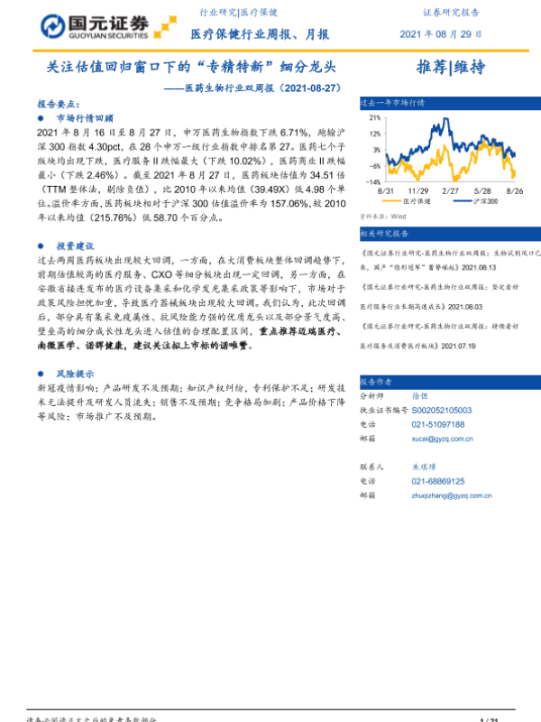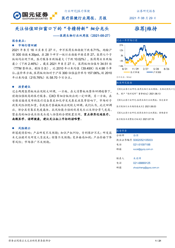 【国元证券】【20210829】医药生物行业双周报:关注估值回归窗口下的“专精特新”细分龙头-21页
