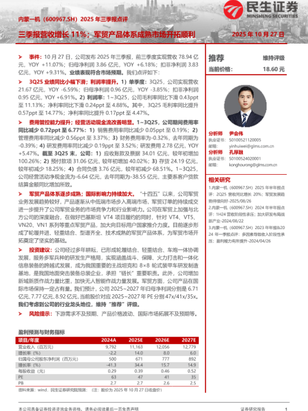 【民生证券】【202510】2025年三季报点评:三季报营收增长11%;军贸产品体系成熟市场开拓顺利-3页