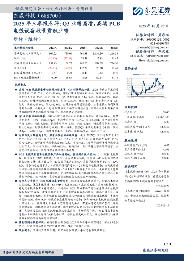 【东吴证券】【202510】2025年三季报点评:Q3业绩高增,高端 PCB 电镀设备放量贡献业绩-3页
