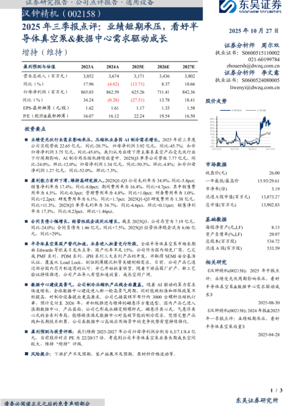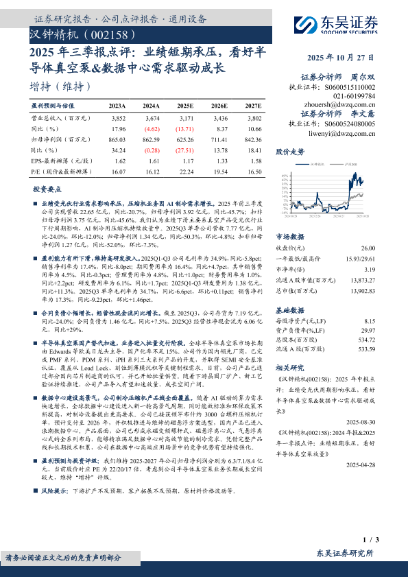 【东吴证券】【202510】2025年三季报点评:业绩短期承压,看好半导体真空泵&数据中心需求驱动成长-3页