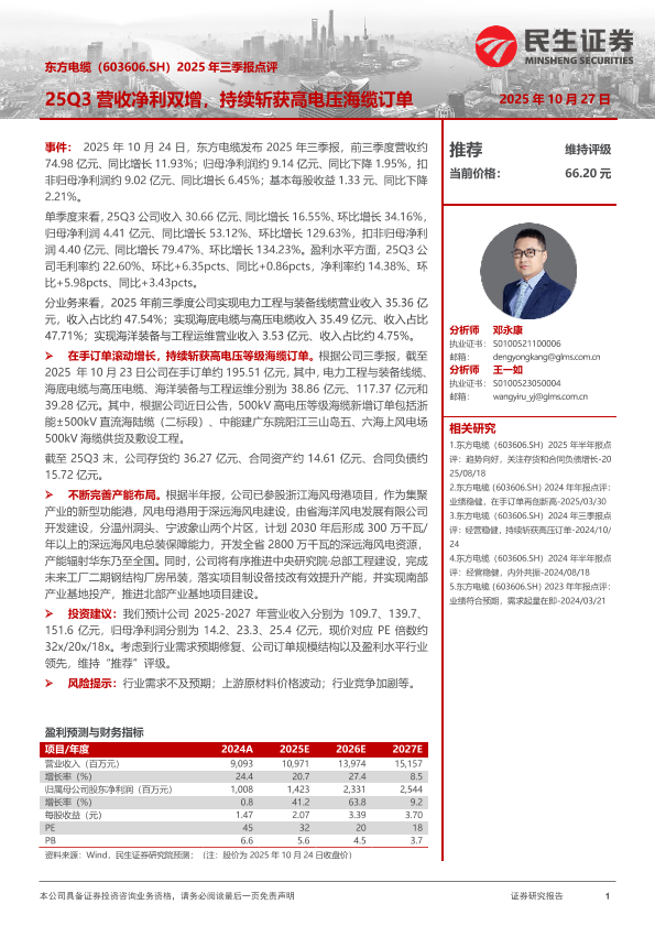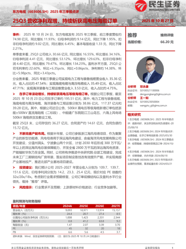 【民生证券】【202510】2025年三季报点评:25Q3营收净利双增,持续斩获高电压海缆订单-3页