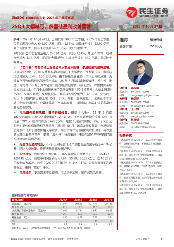 【民生证券】【202510】2025年三季报点评:25Q3大幅减亏,多晶硅盈利改善显著-3页