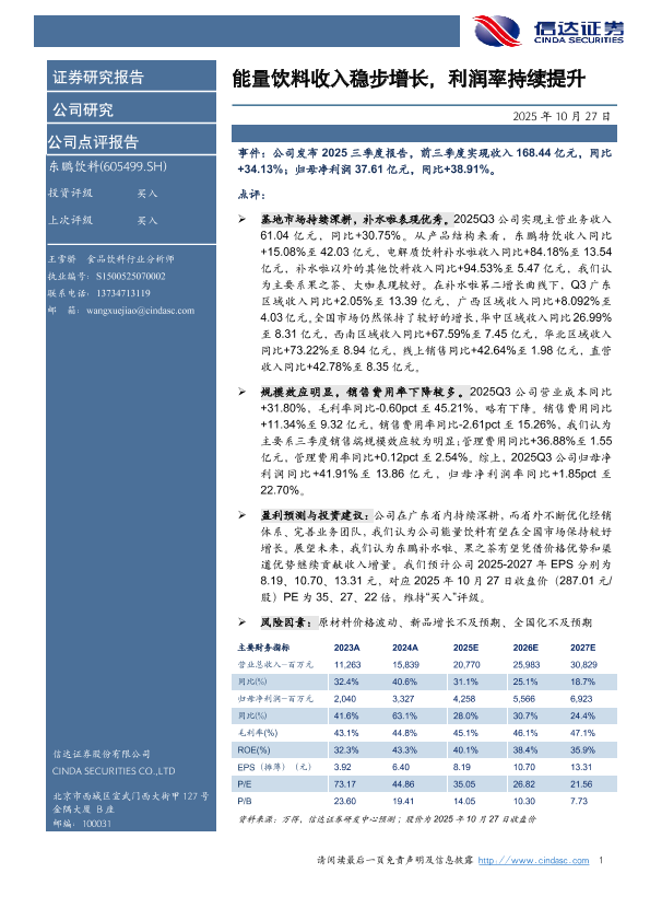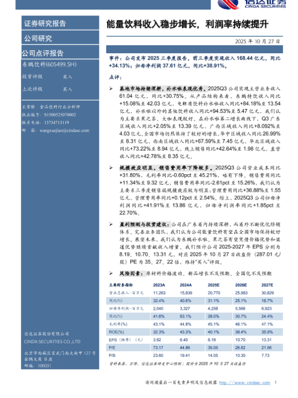【信达证券股份有限公司 CINDA SECURITIES CO.<D】【202510】能量饮料收入稳步增长,利润率持续提升-3页