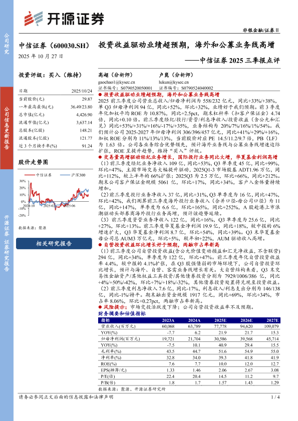 【开源证券】【202510】中信证券2025三季报点评:投资收益驱动业绩超预期,海外和公募业务线高增-4页