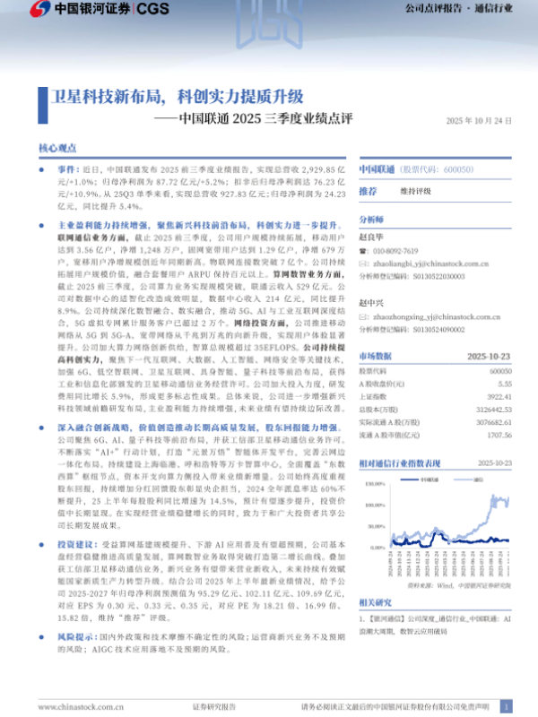 【银河证券】【202510】中国联通2025三季度业绩点评:卫星科技新布局,科创实力提质升级-4页