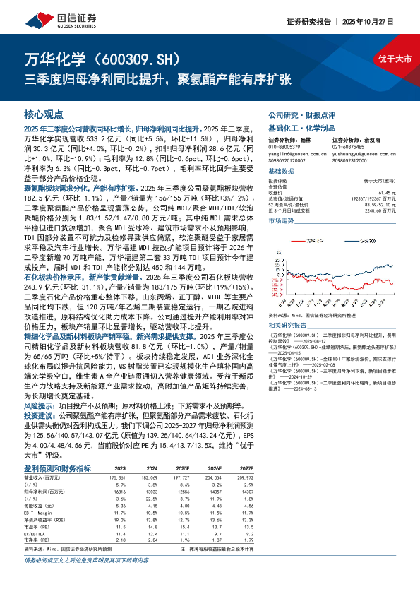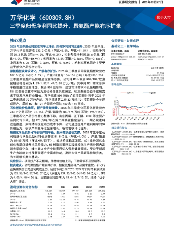 【国信证券】【202510】2025年10月27日 优于大市 万华化学(600309.SH) 三季度归母净利同比提升,聚氨酯产能有序扩张-8页