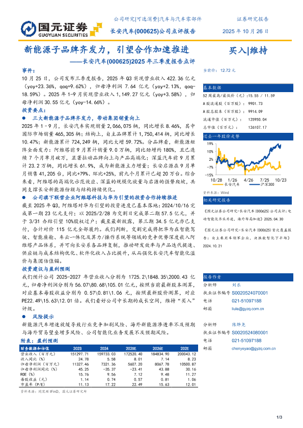 【国元证券】【202510】长安汽车(000625)2025年三季度报告点评——子品牌齐发力,引望合作加速推进-3页