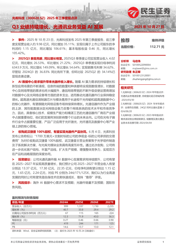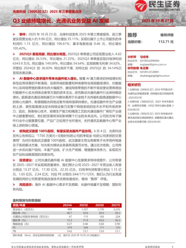 【民生证券】【202510】光库科技(300620.SZ)2025年三季度报点评:Q3业绩持续增长,光通讯业务受益AI发展-3页