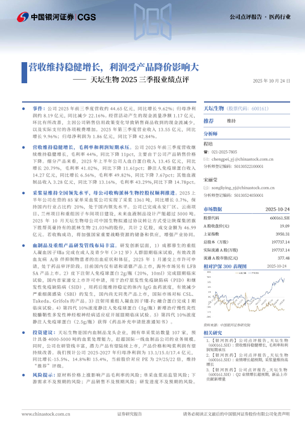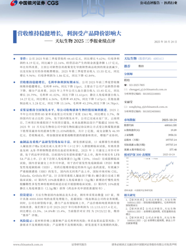 【银河证券】【202510】天坛生物2025三季报业绩点评:营收维持稳健增长,利润受产品降价影响大-4页