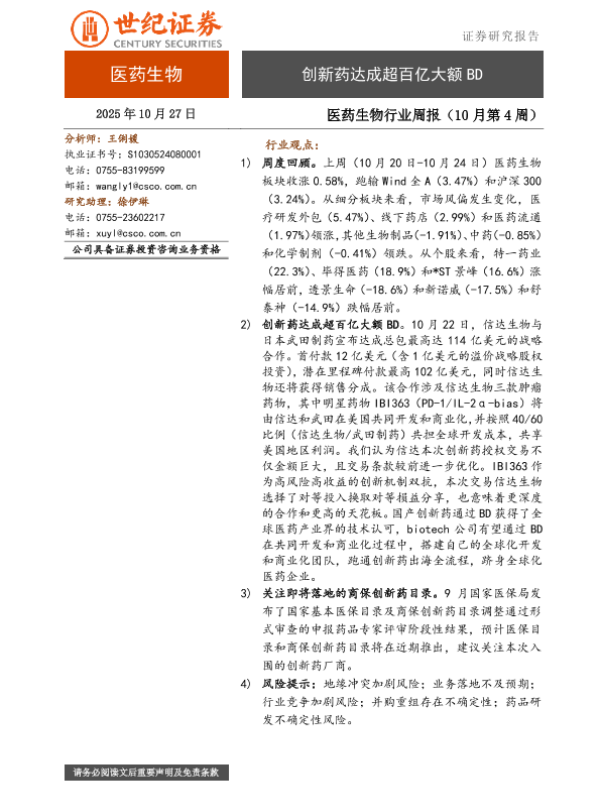 【世纪证券】【202510】医药生物行业周报(10月第4周)-9页