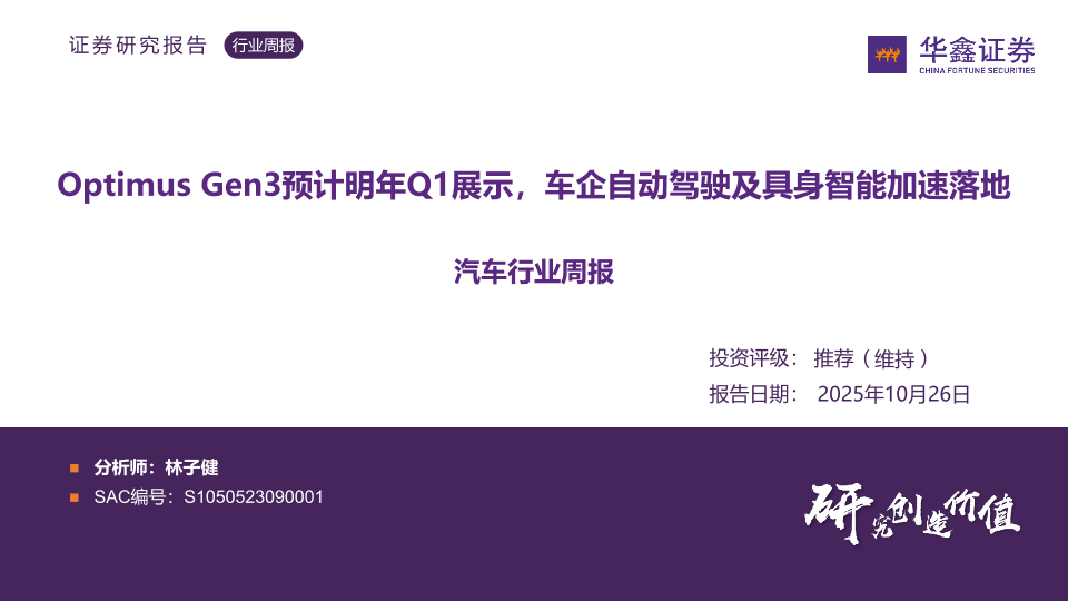【华鑫证券】【202510】汽车行业周报:Optimus Gen3预计明年Q1展示,车企自动驾驶及具身智能加速落地-32页