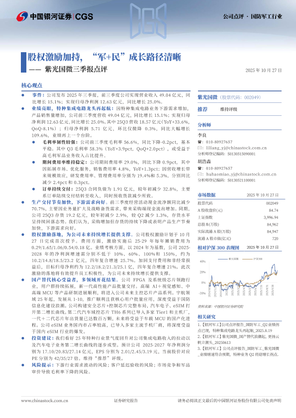【银河证券】【202510】股权激励加持,“军+民”成长路径清晰——紫光国微三季报点评-4页