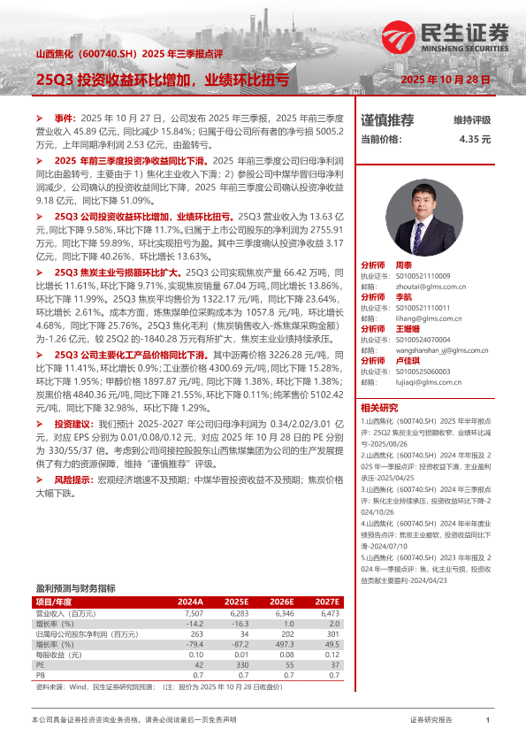业绩扭亏 焦炭主业 投资收益 盈利预测 焦化