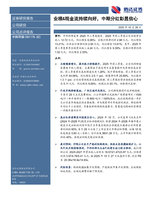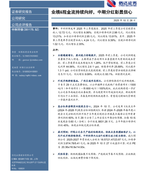 环保 并购扩张 分红政策 现金流 财报分析