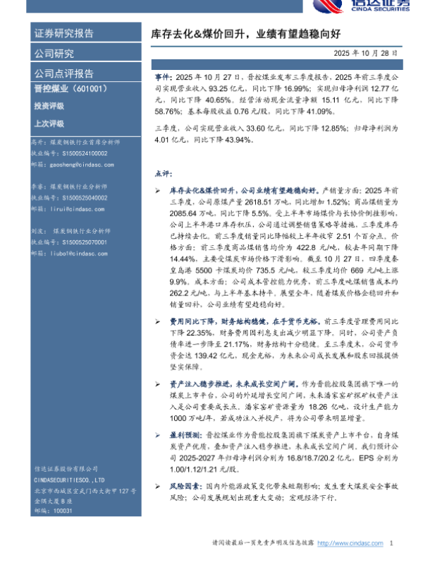 【信达证券股份有限公司 C INDASECUR IT IESCO.<D】【202510】库存去化&煤价回升,业绩有望趋稳向好-5页