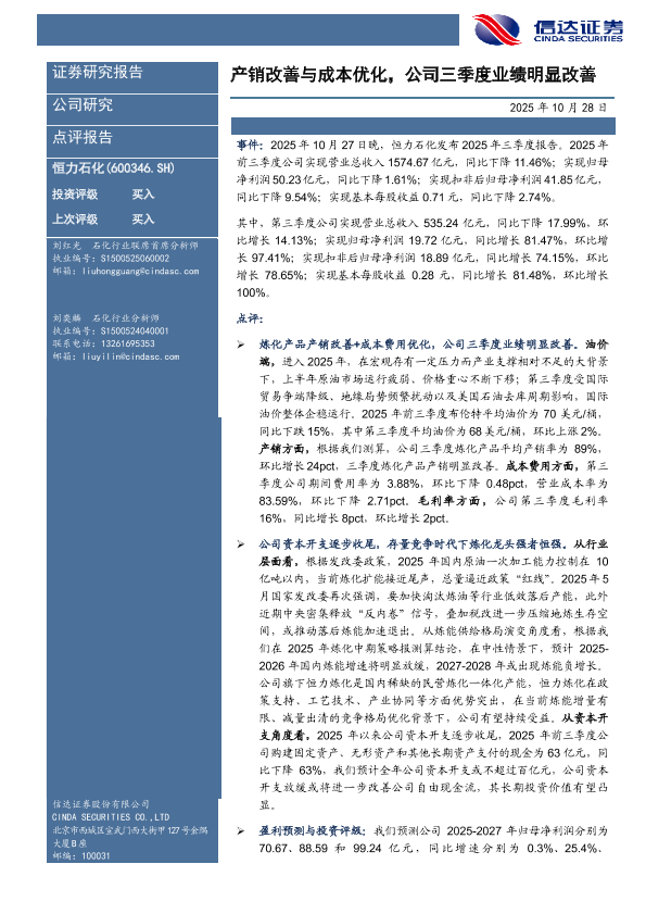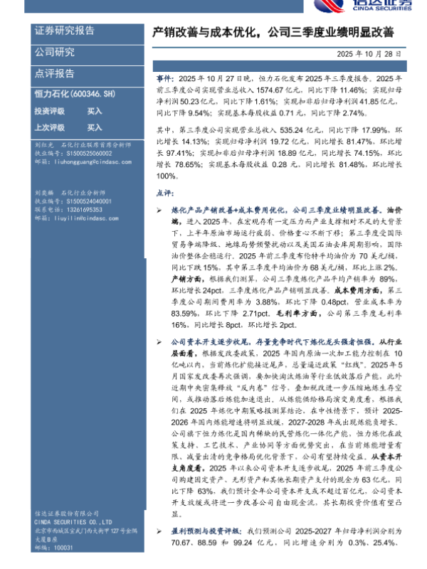 投资评级 业绩改善 自由现金流 成本优化 炼化行业