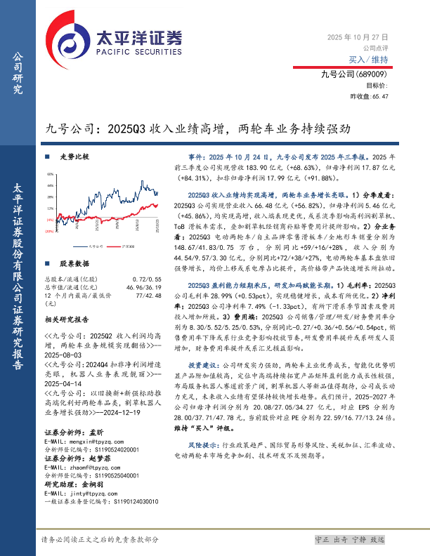 【太平洋证券】【202510】九号公司:2025Q3收入业绩高增,两轮车业务持续强劲-5页