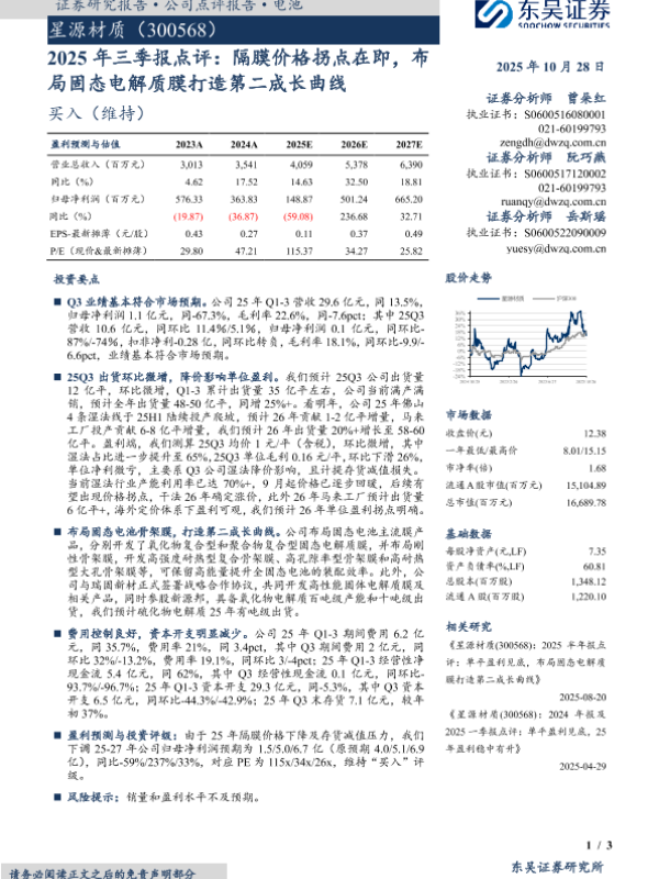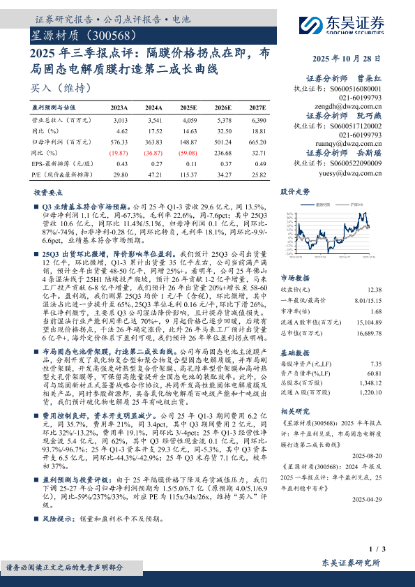 【东吴证券】【202510】2025年三季报点评:隔膜价格拐点在即,布局固态电解质膜打造第二成长曲线-3页