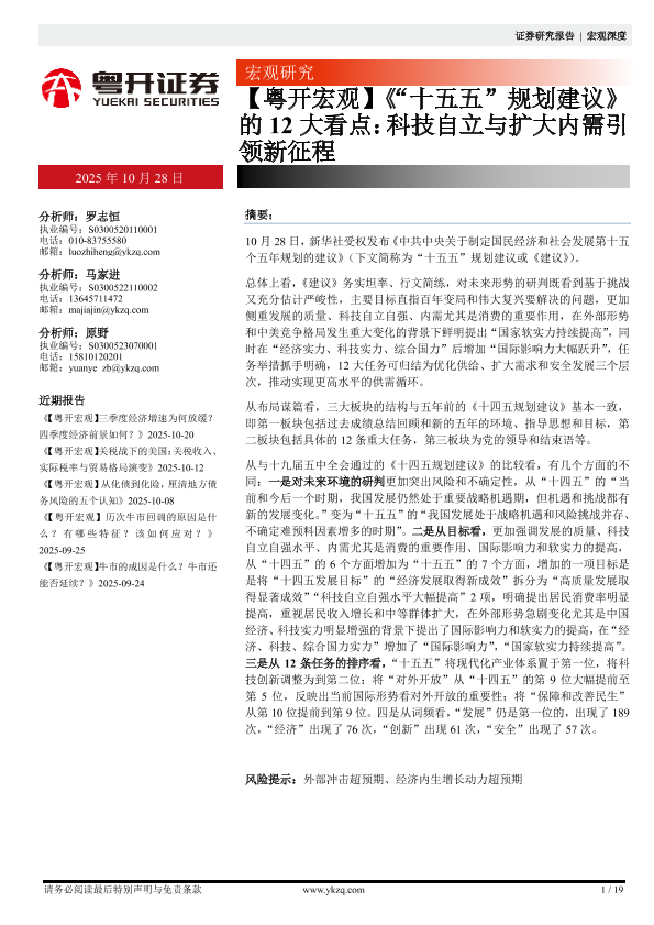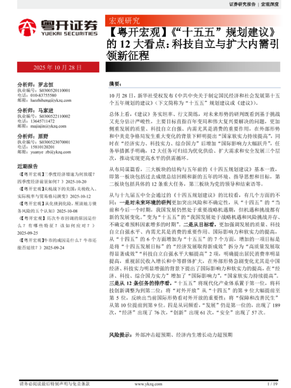 【粤开证券】【202510】《“十五五”规划建议》的12大看点:科技自立与扩大内需引领新征程-19页