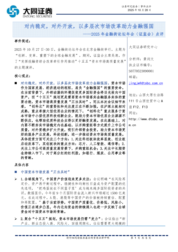 【大同证券研究中心】【202510】对内稳定,对外开放,以多层次市场改革助力金融强国——2025年金融街论坛年会(证监会)点评-5页