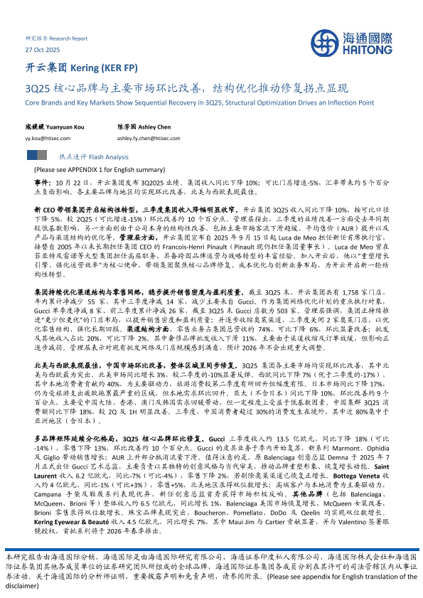 【海通国际】【202510】开云集团(KER FP)3Q25核心品牌与主要市场环比改善,结构优化推动修复拐点显现-11页